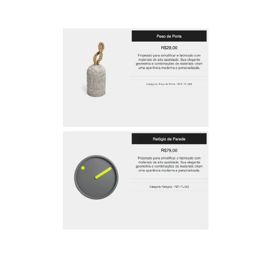 O catálogo PDF com 2 produtos por página mostra a imagem e as informações principais do seu produto.