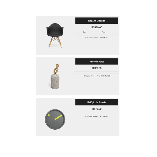 O catálogo PDF com 3 produtos por página mostra a imagem e as informações principais do seu produto.