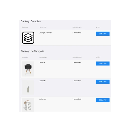 Você pode gerar o catálogo completo, o catálogo de cada categoria de produtos e também a lâmina de cada produto.