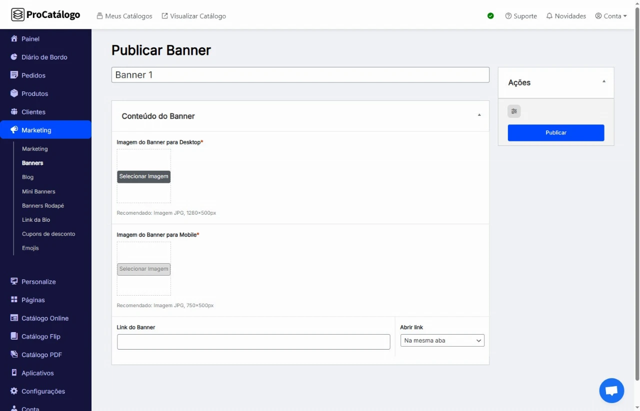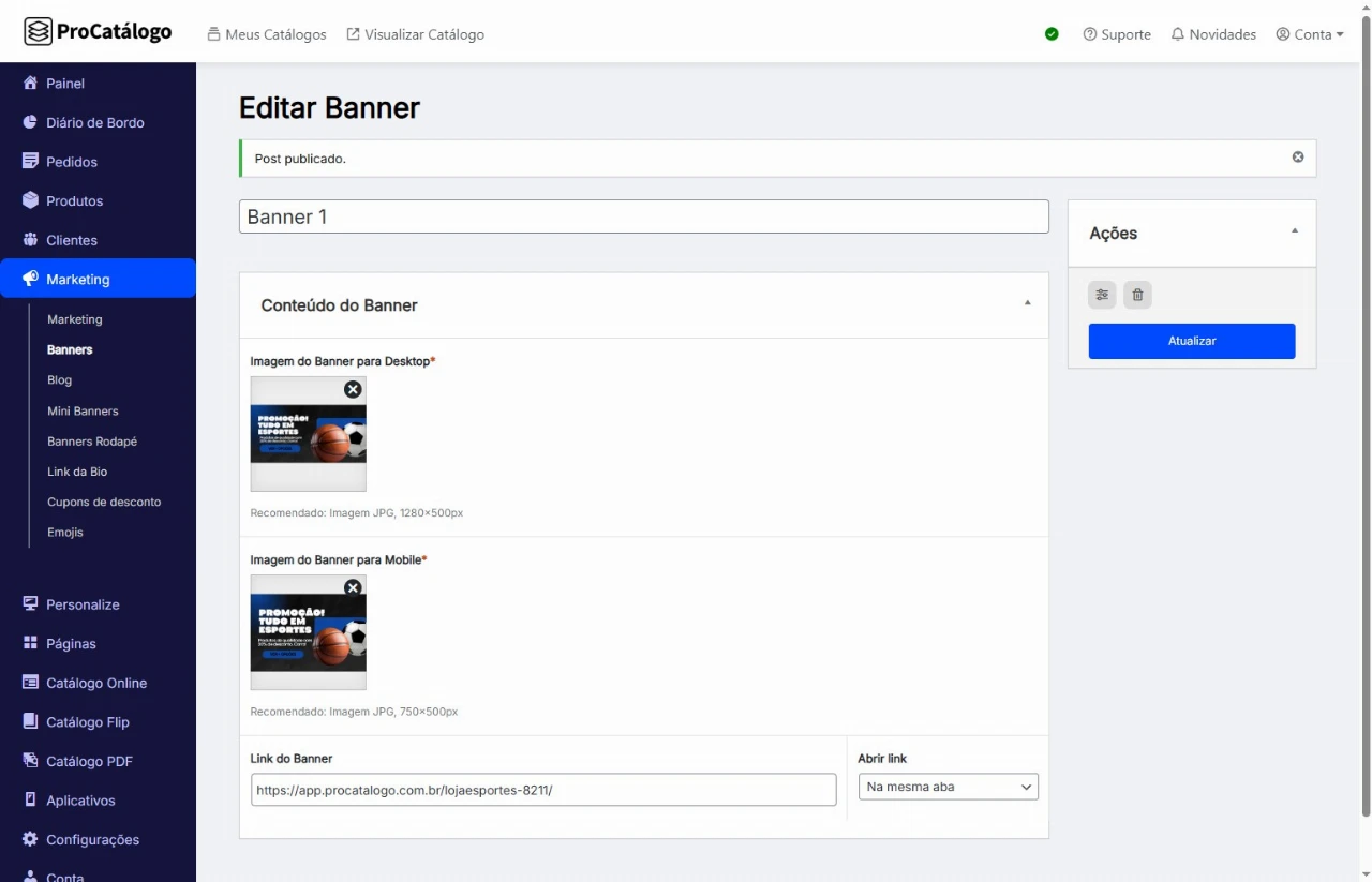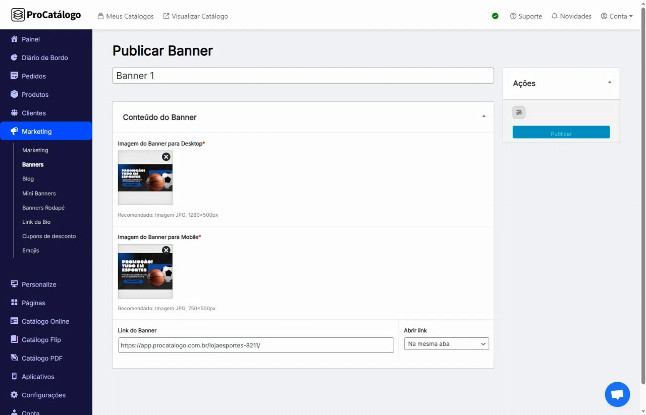 Clique em Publicar para salvar suas configurações e exibir o banner no seu catálogo.