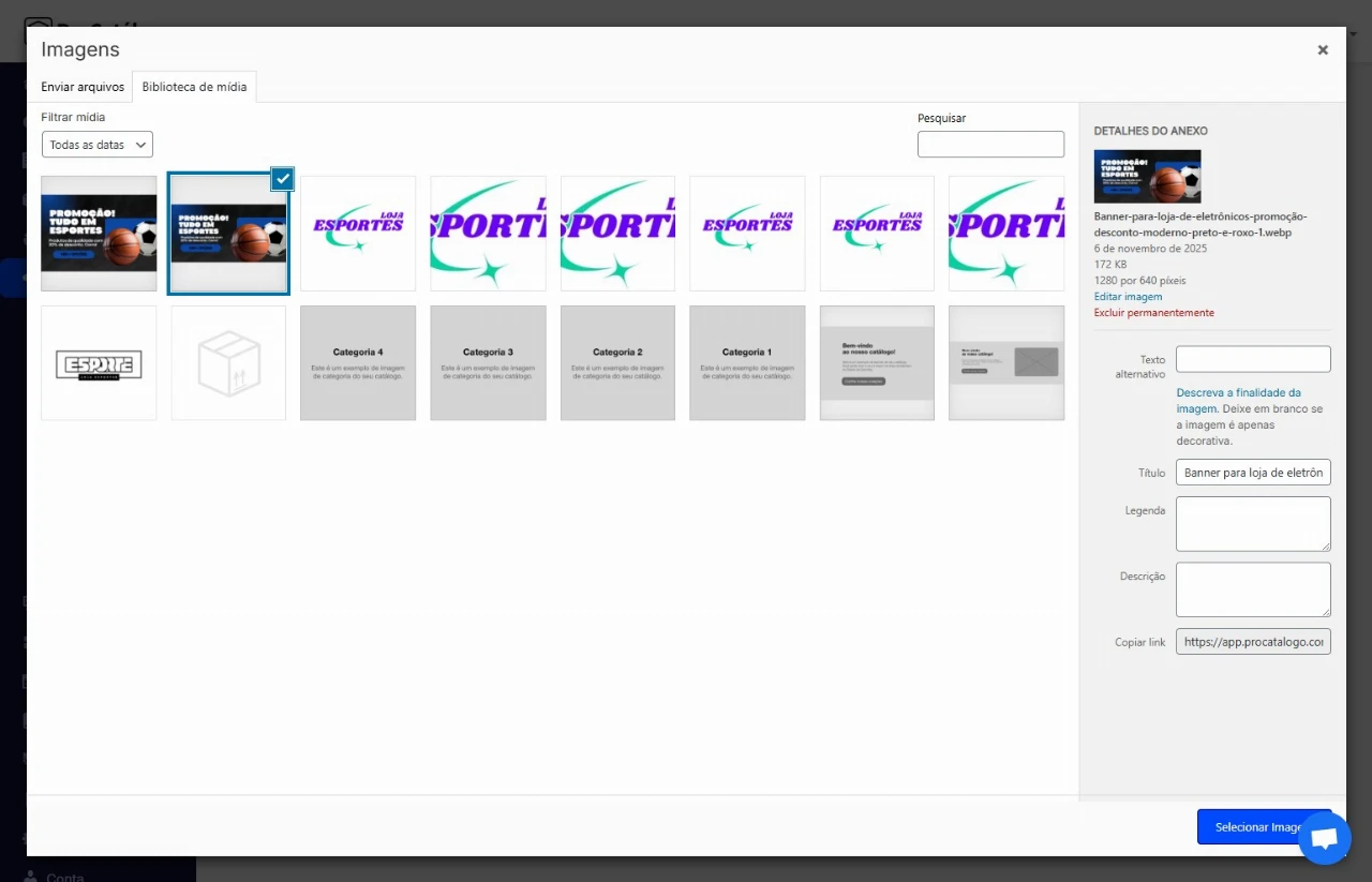 No campo Imagem do Banner para Desktop, clique em Selecionar Imagem e escolha a imagem que será exibida no seu catálogo quando acessado por computadores.