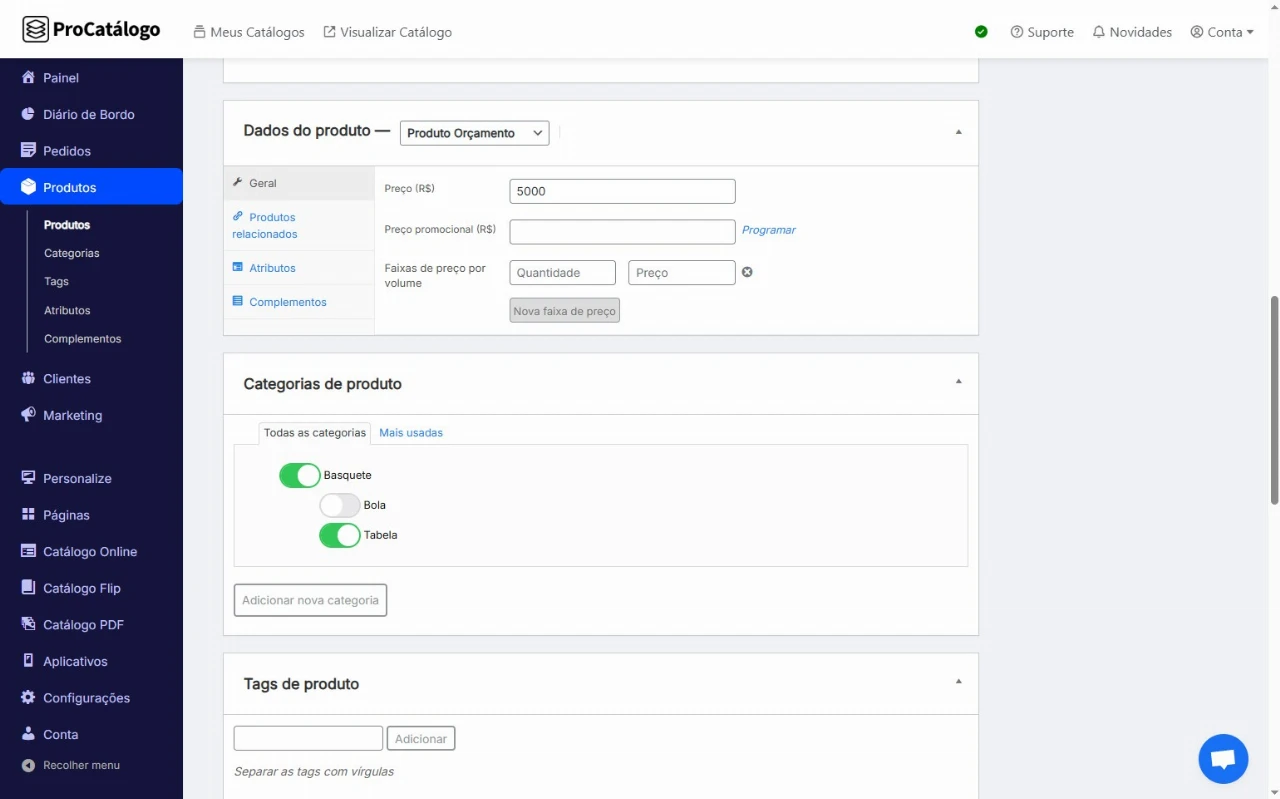 Em Dados do produto, escolha a opção Produto Orçamento.