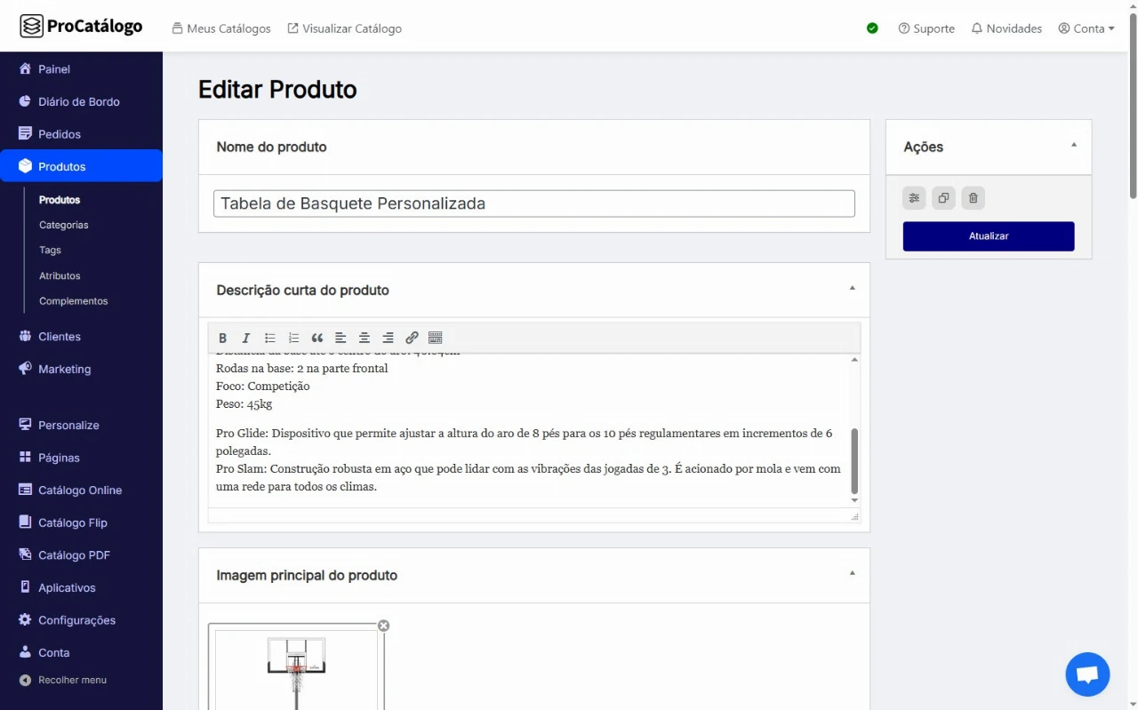Em Imagem principal do produto, insira a imagem de capa, que será exibida para o cliente no catálogo.