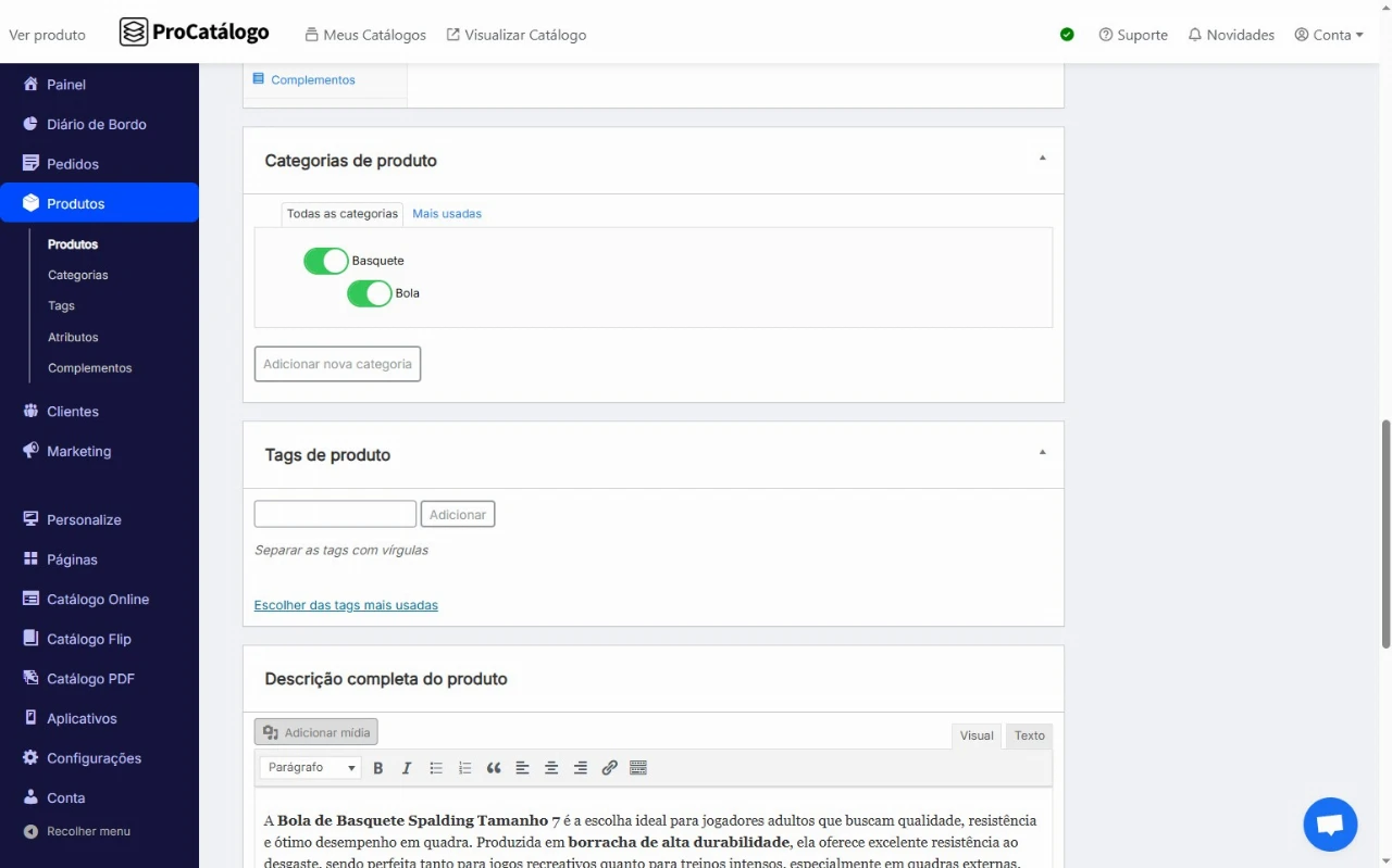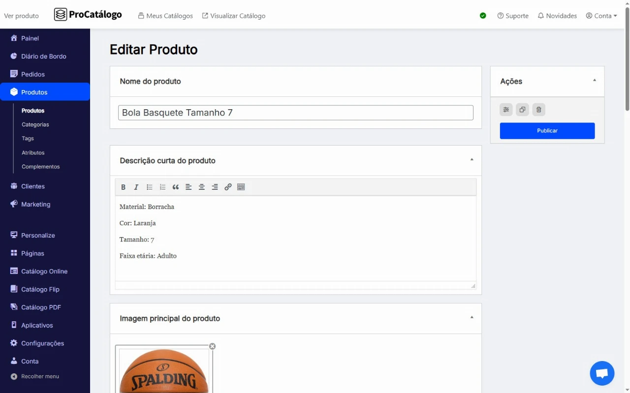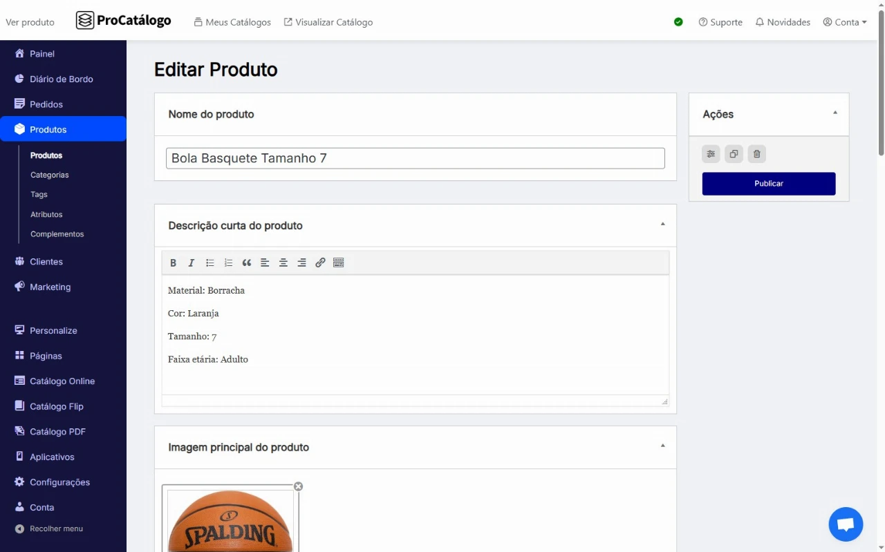 Para publicar seu produto, clique em Publicar e, para visualizar como ele ficará no catálogo, clique em Ver produto.