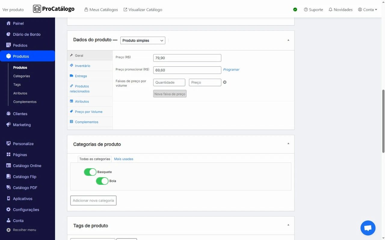 Na aba Geral, insira o Preço do produto, e, se desejar fazer uma promoção, você pode inserir o Preço promocional do seu produto.