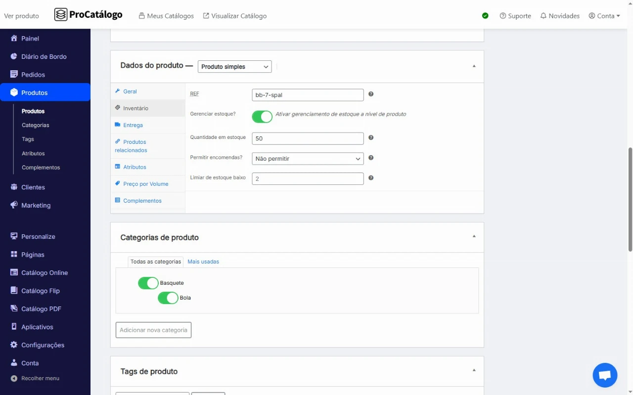 Para gerenciar seu estoque, ative a opção Gerenciamento de estoque e preencha as informações necessárias:
