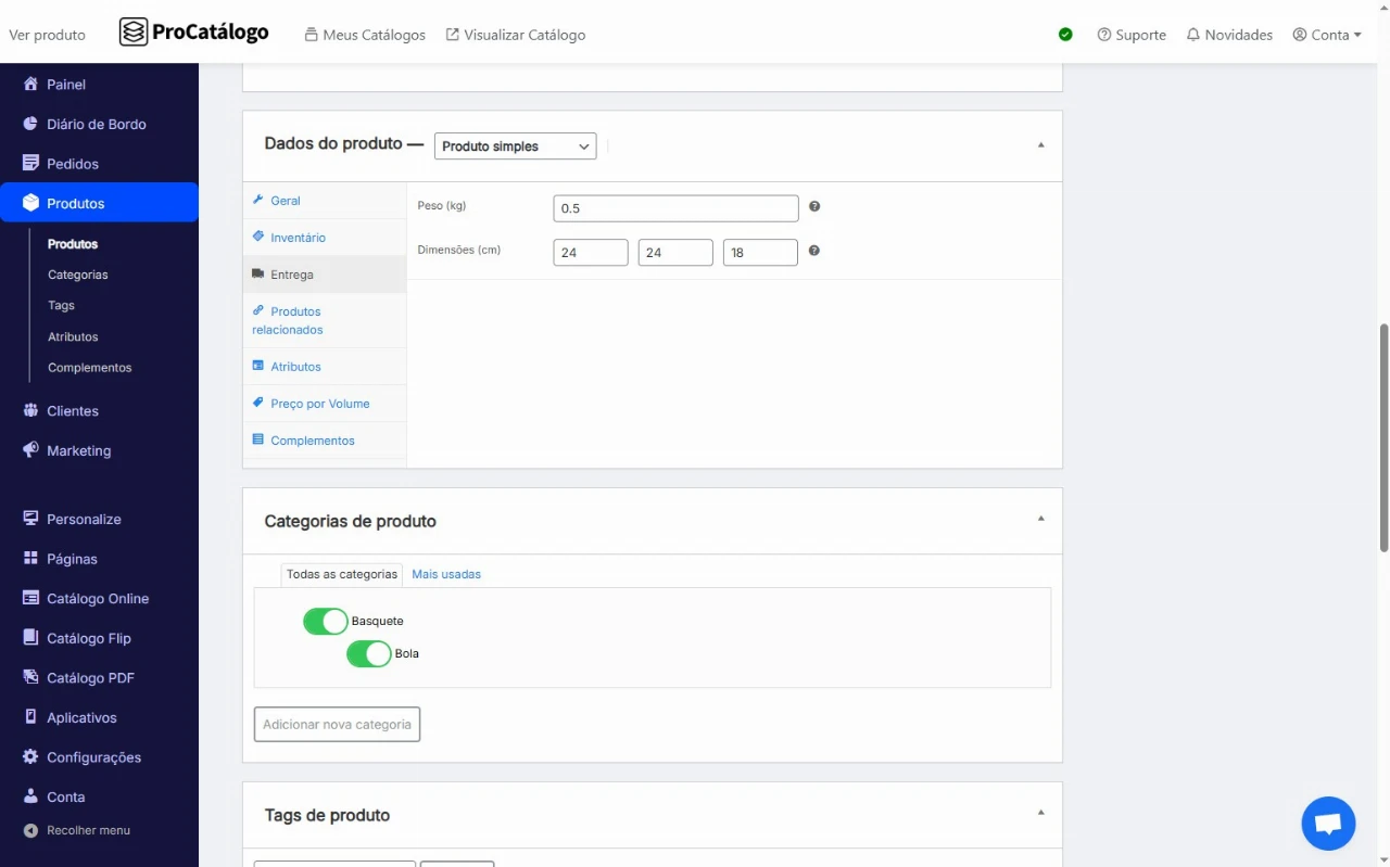 Na aba Entrega, insira as informações do produto embalado, como peso e dimensões da embalagem final que será enviada ao cliente.
