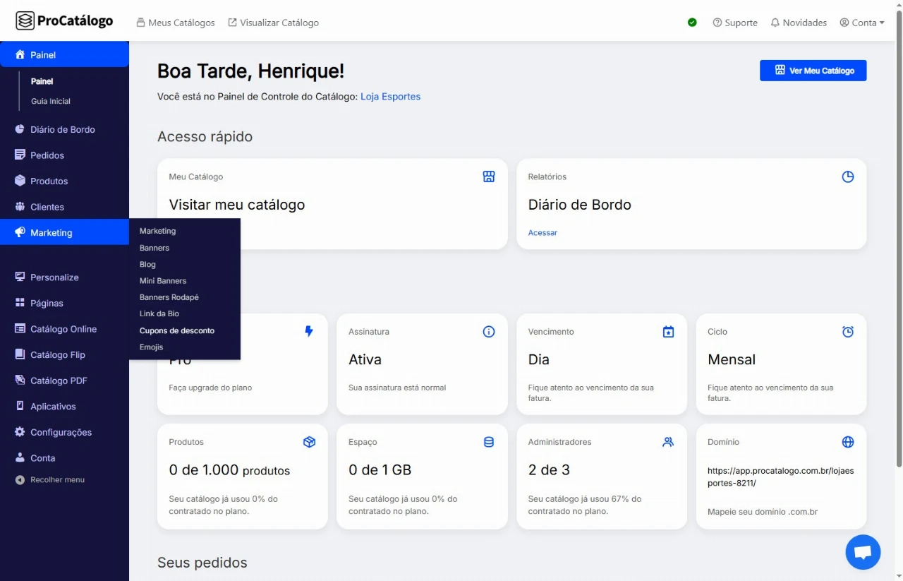 No menu lateral, vá até a seção Marketing e clique em Cupons de Desconto.