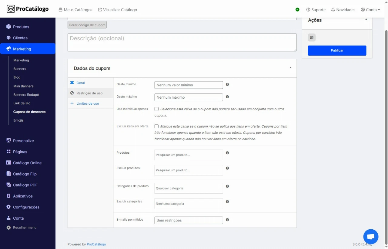 Agora, na aba Restrição de Uso, você pode configurar as restrições para o uso do cupom. As configurações que você fizer aqui, alteram significativamente o uso do cupom pelo seu cliente. Portanto, configure adequadamente.