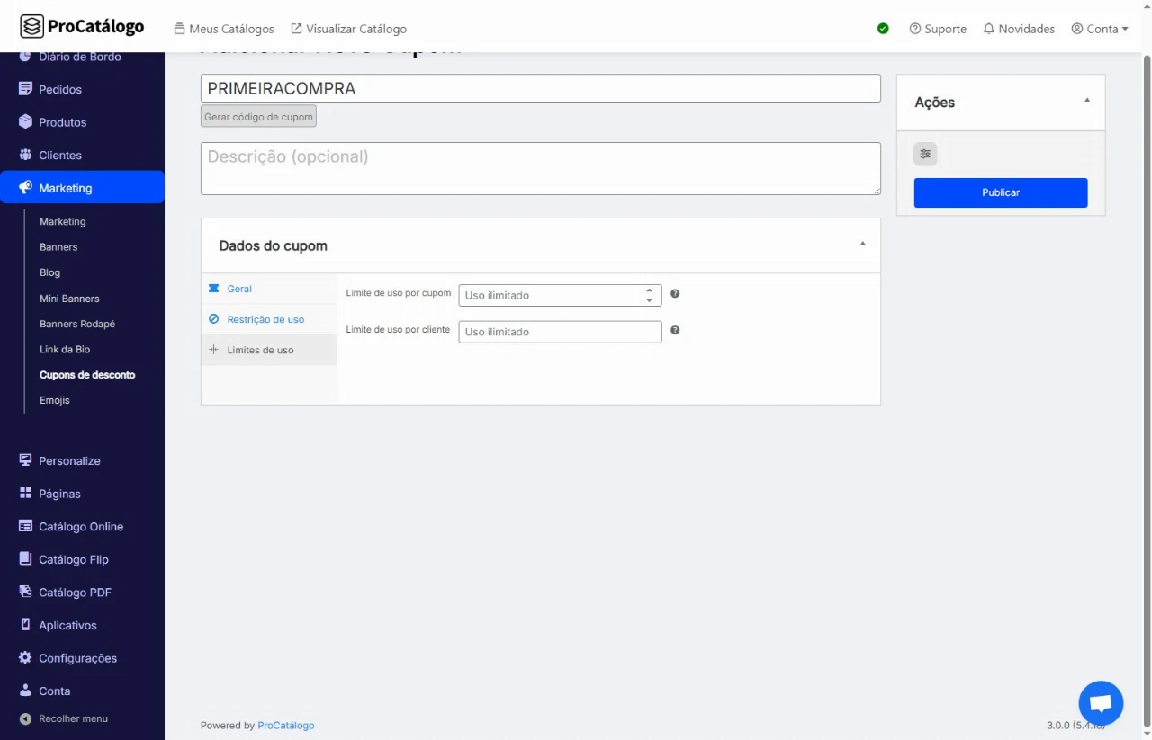 Agora, na aba Limites de Uso, defina o limite de uso por cupom, ou seja, quantos cupons estão disponíveis ao todo.
