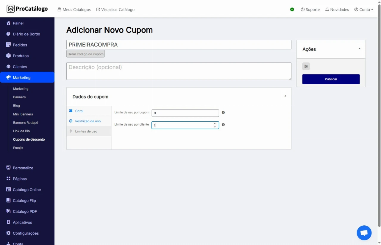 No campo Limite de Uso por Cliente, defina a quantidade de vezes que cada usuário poderá utilizar este cupom.