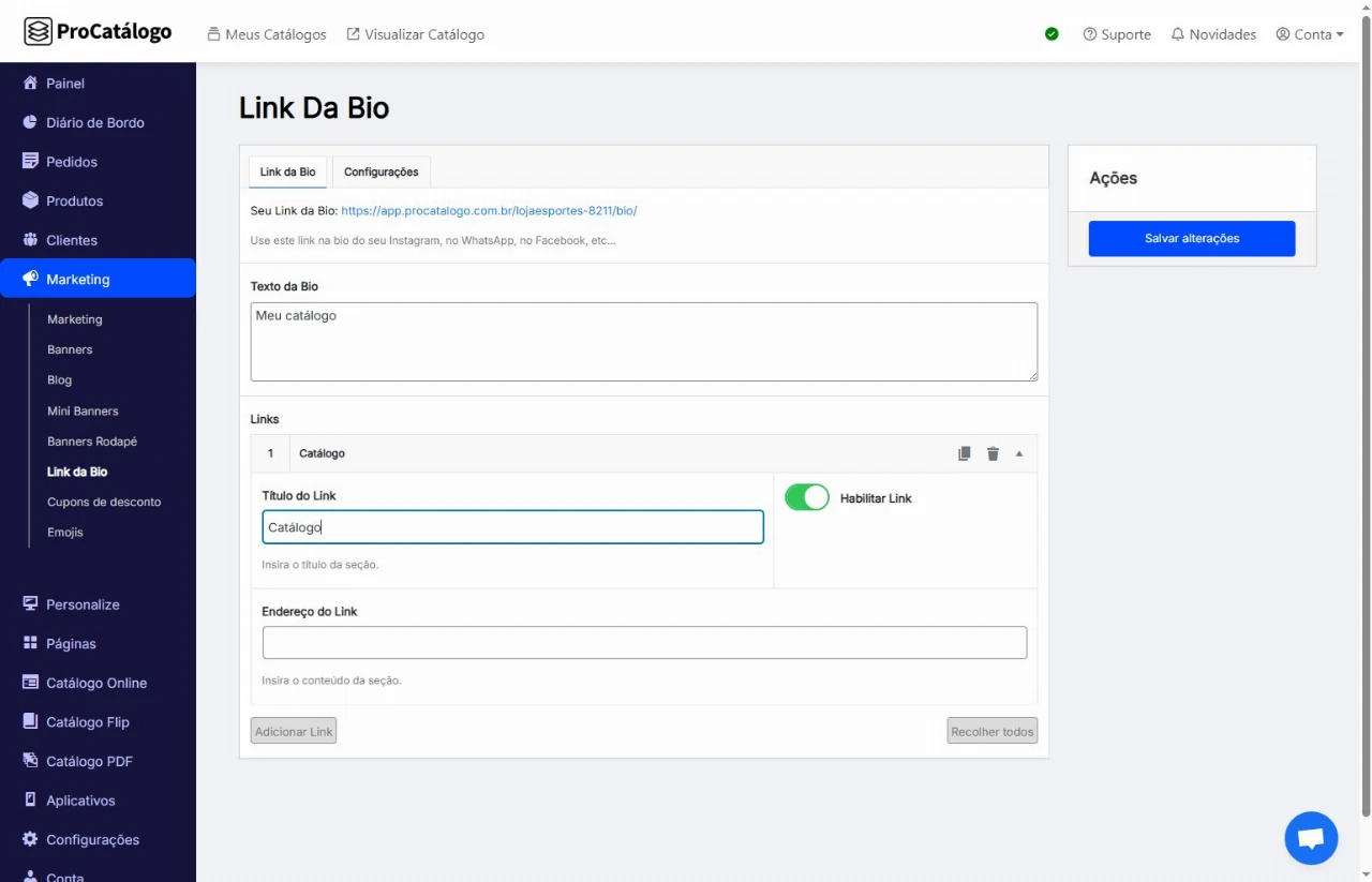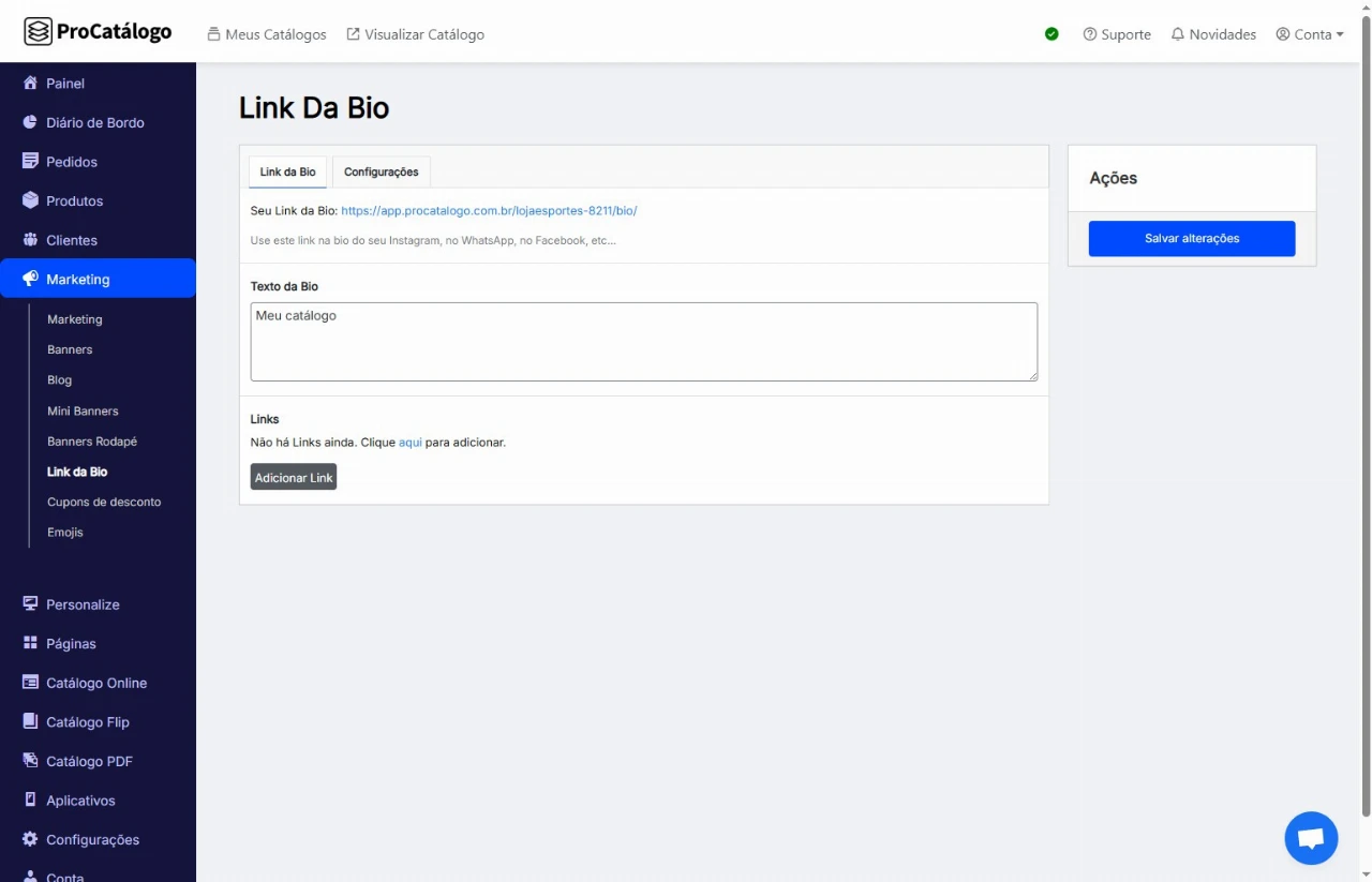 No menu lateral, vá em Marketing e, em seguida, acesse a seção Link da Bio.
