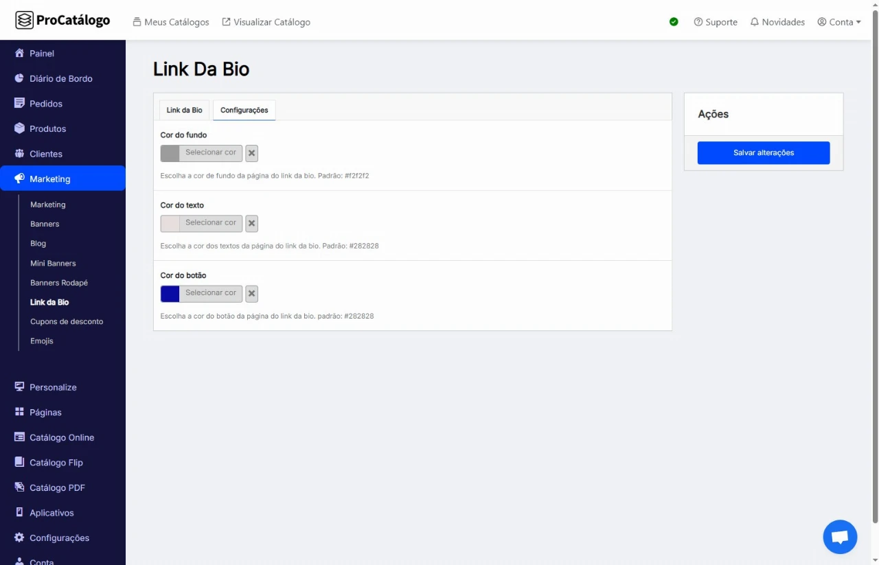 Para configurar as cores do seu Link da Bio, clique na aba Configurações.