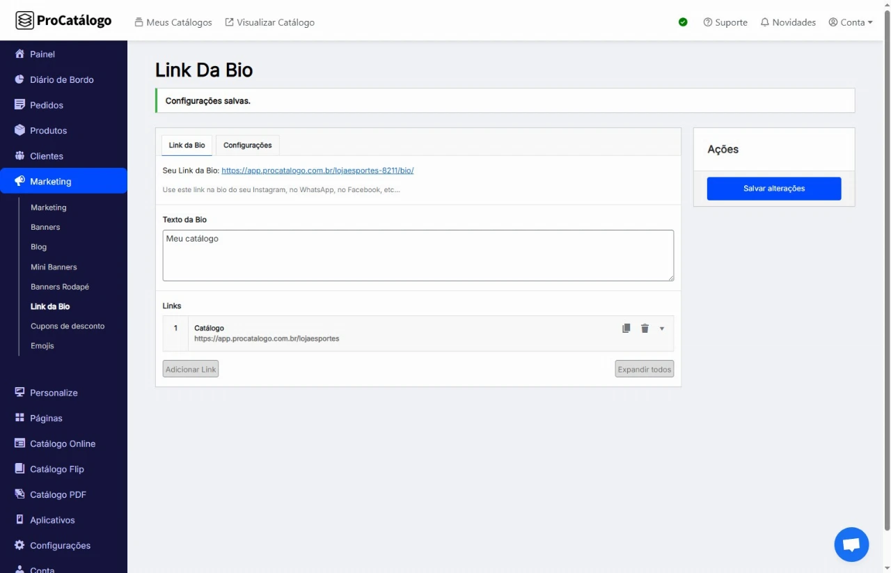 ✅ Pronto! Seu Link da Bio está pronto e já pode ser adicionado na bio das suas redes sociais, direcionando seus seguidores para o seu catálogo.