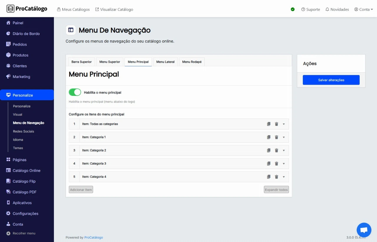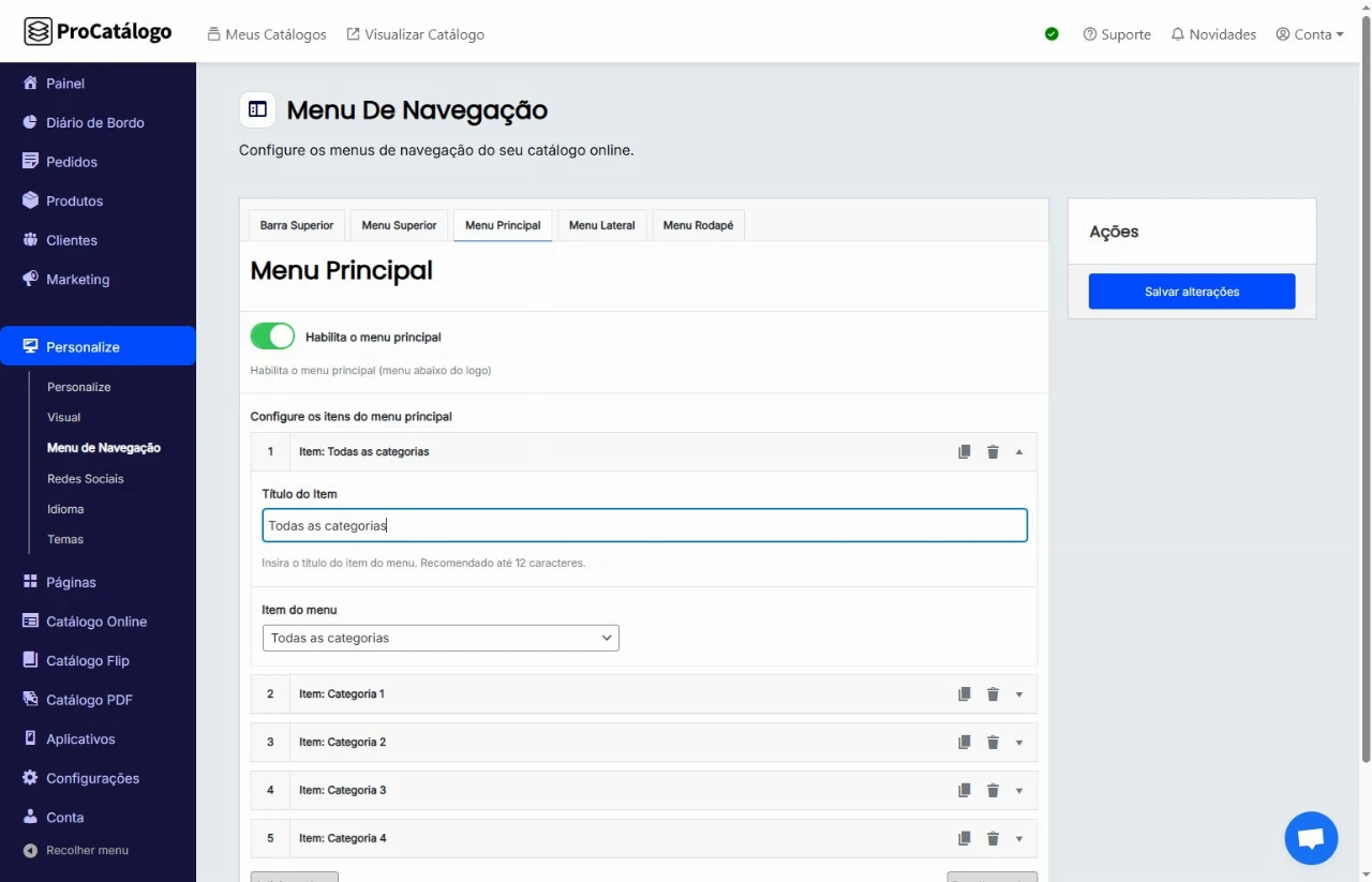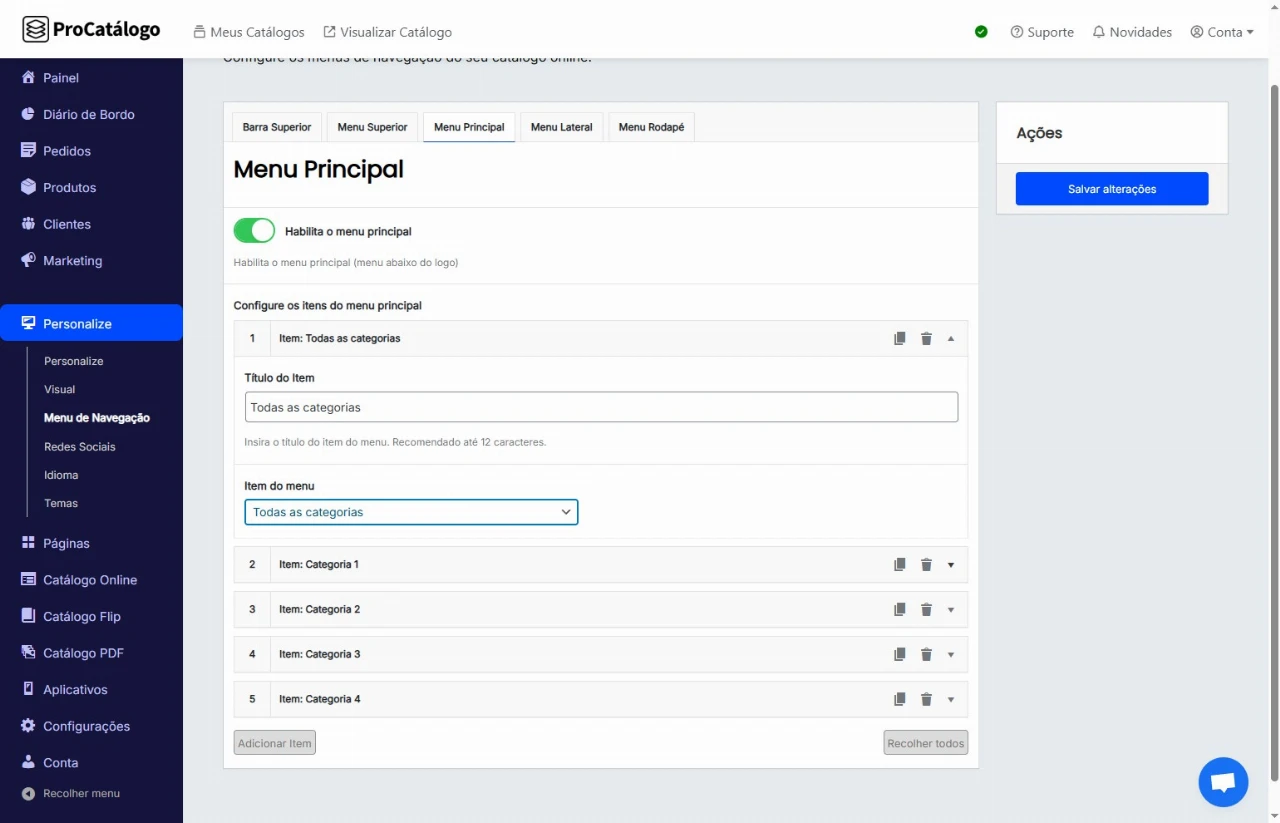 Em Menu de Navegação, clique na aba Menu Principal.